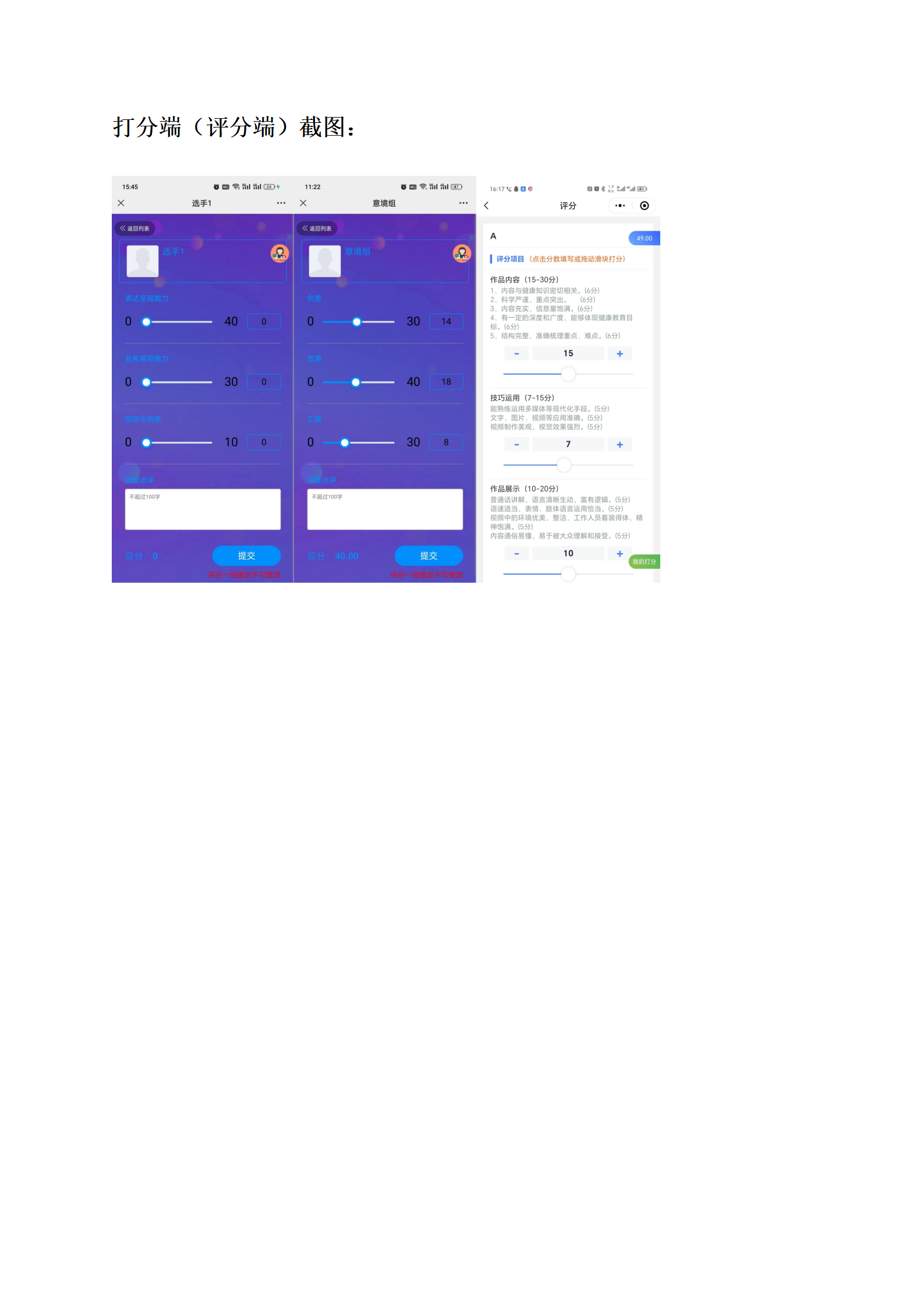 后台设置打分模式 → 2. 评委进入对应打分界面 → 3. 按提示完成评分(多项打分需对每个维度评分)